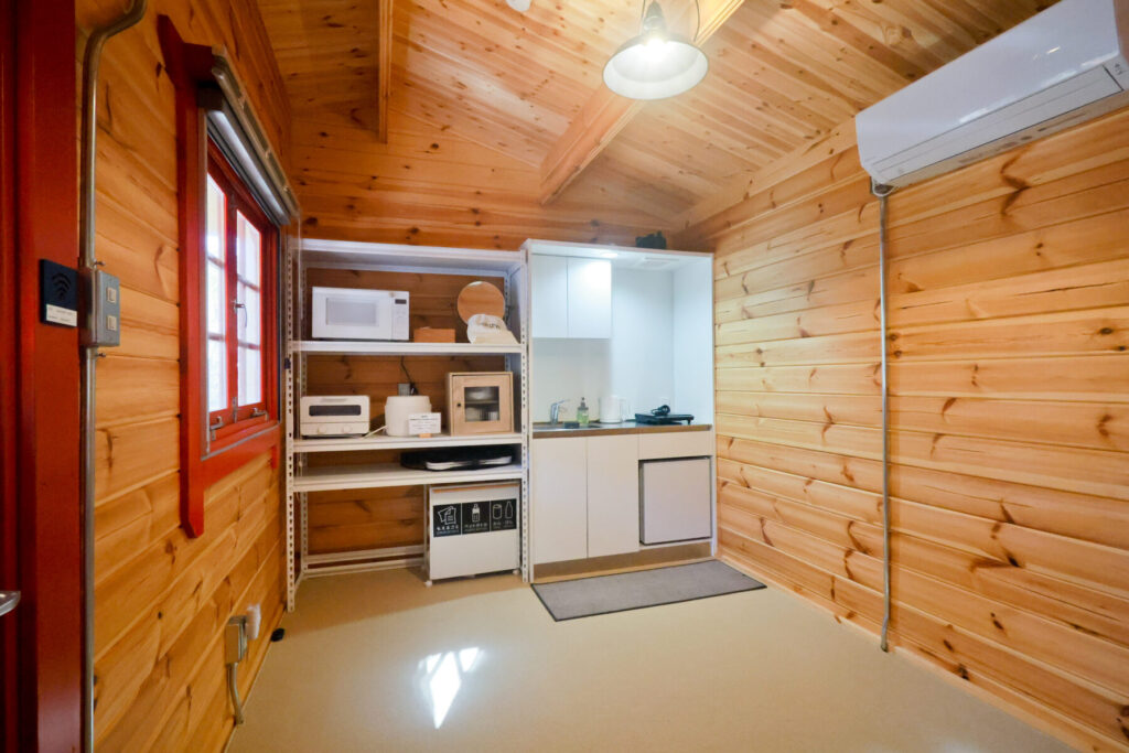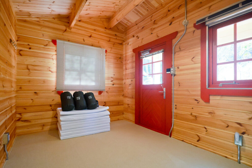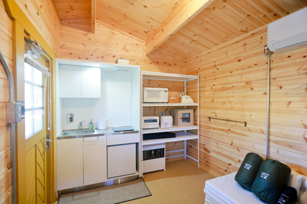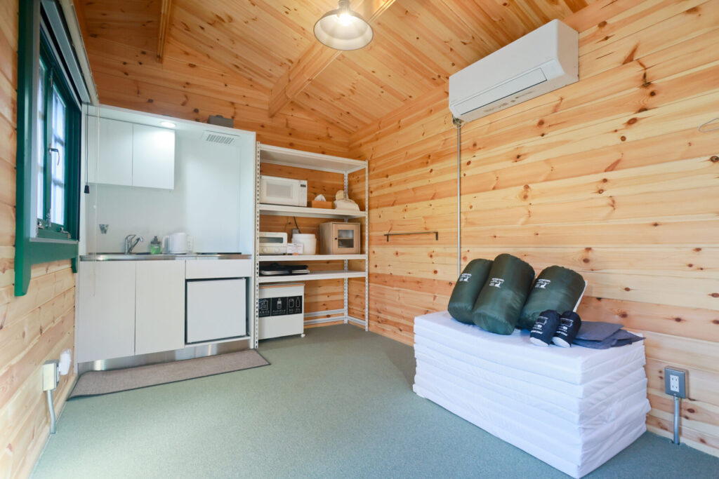 木の質感を活かした北欧テイストのバンガローで、自然に囲まれながら心安らぐひとときをお過ごしいただけます。 冷暖房を完備しており、季節を問わず快適にご利用いただけます。